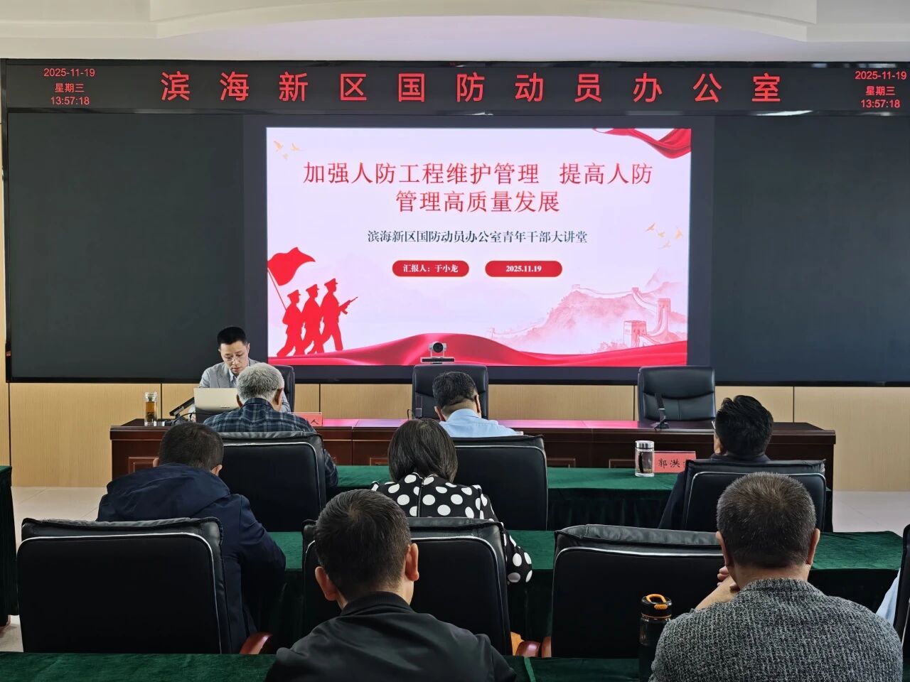 11月19日,滨海新区国防动员办公室成功举办第三期国防动员青年干部大讲堂。党组书记、主任窦汝春,班子成员以及机关和人防指挥信息保障中心的全体干部参加活动。工程管理室干部于小龙以“加强人防工程维护管理,提高人防管理高质量发展”为主题进行授课,围绕人防工程的核心价值、当前面临的挑战、国内外经验借鉴以及新区实践等方面展开深入交流,为推动人防事业高质量发展进一步凝聚共识。