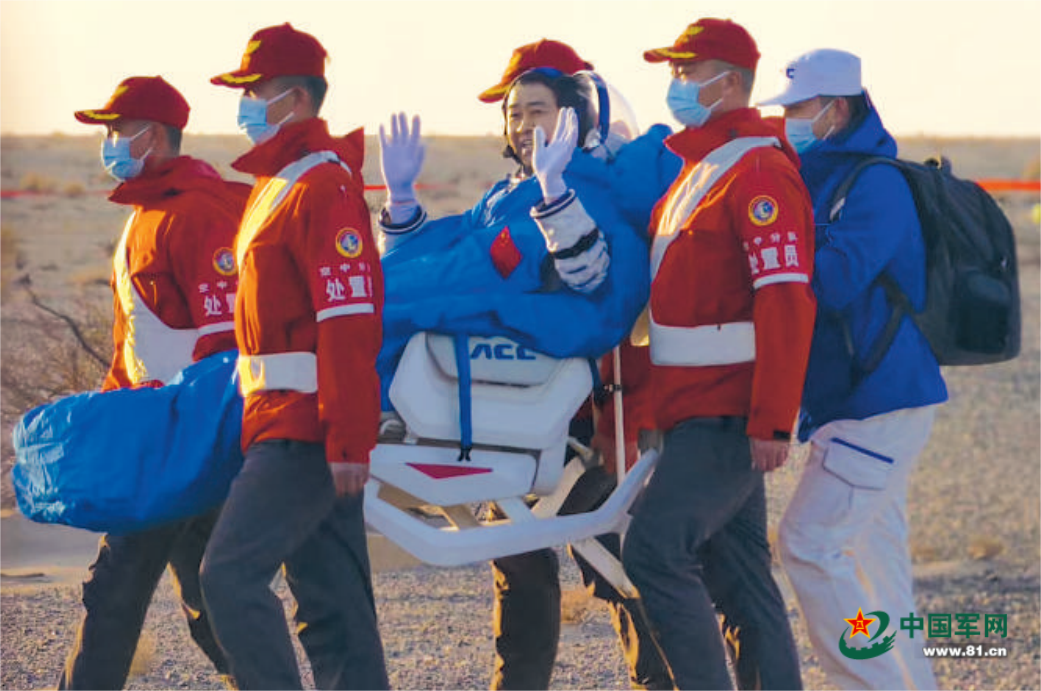 与此同时,通信操作手架设好通信设备,航天员依次向指挥中心报告着陆和身体情况。医监医保人员进入返回舱,为航天员进行初步身体检查。