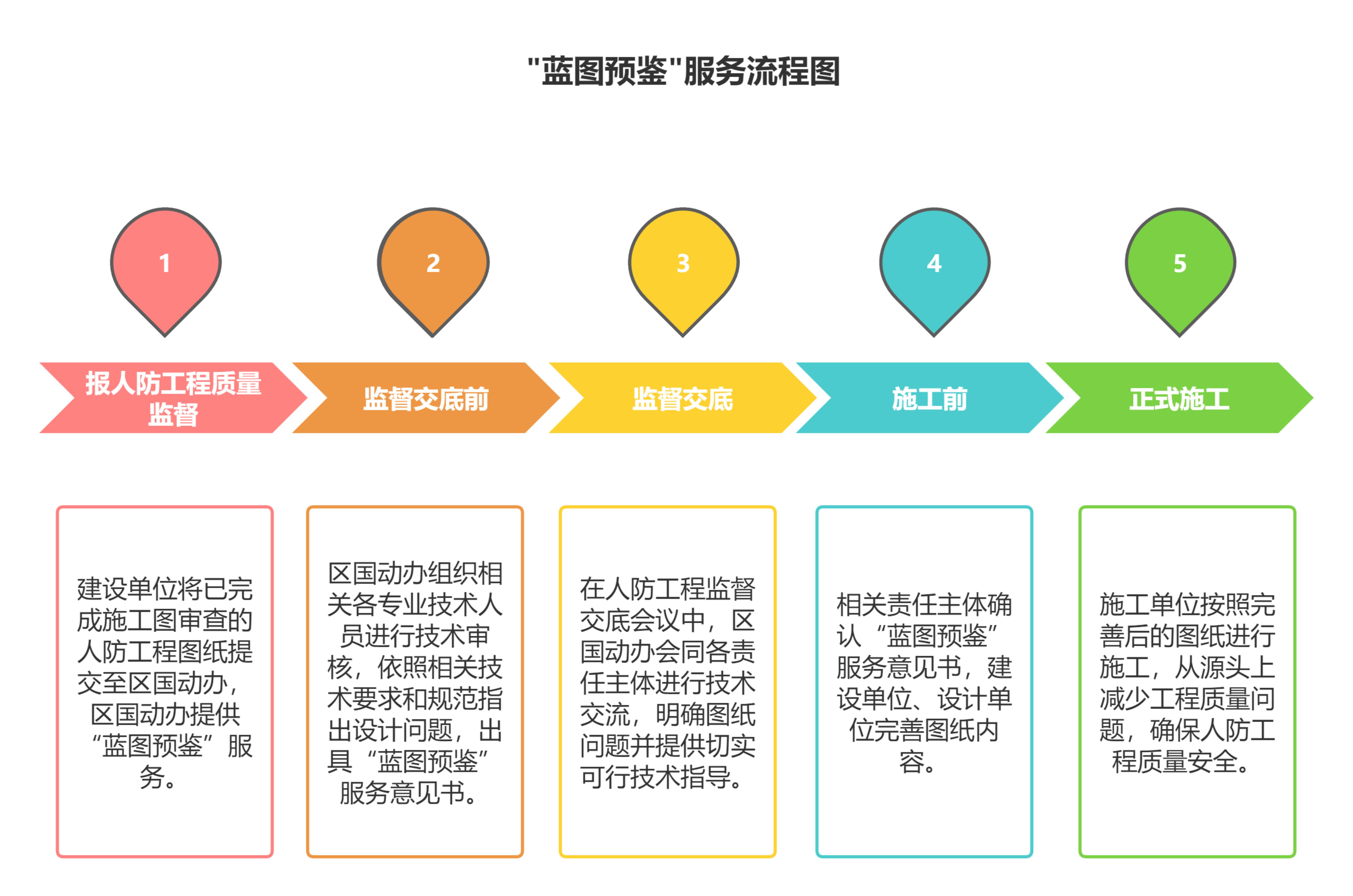 3.过程管理。人防工程建设单位、设计单位按照《“蓝图预鉴”服务意见书》进一步完善施工图纸,施工单位按照完善后的图纸进行现场施工。