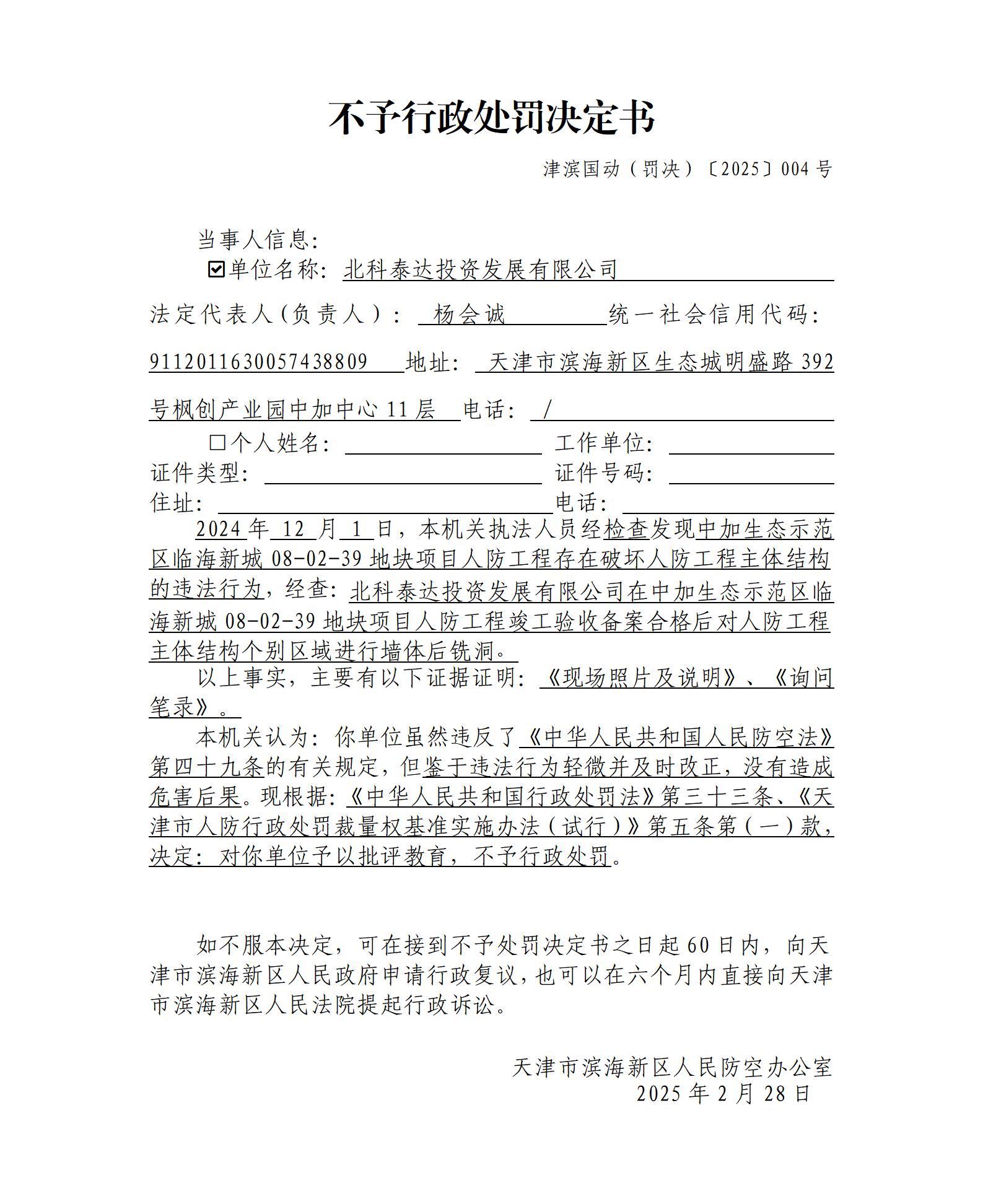 不予行政处罚决定书 津滨国动(罚决)〔2025〕004号